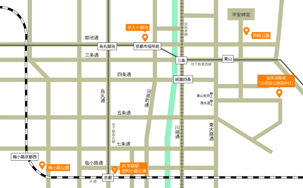 ◆龍馬演舞場(京都霊山護国神社)/高台寺 利生堂/岡崎公園/ゼスト御池 御幸町広場/JR京都駅 室町小路広場(雨天時は駅前広場)/梅小路公園